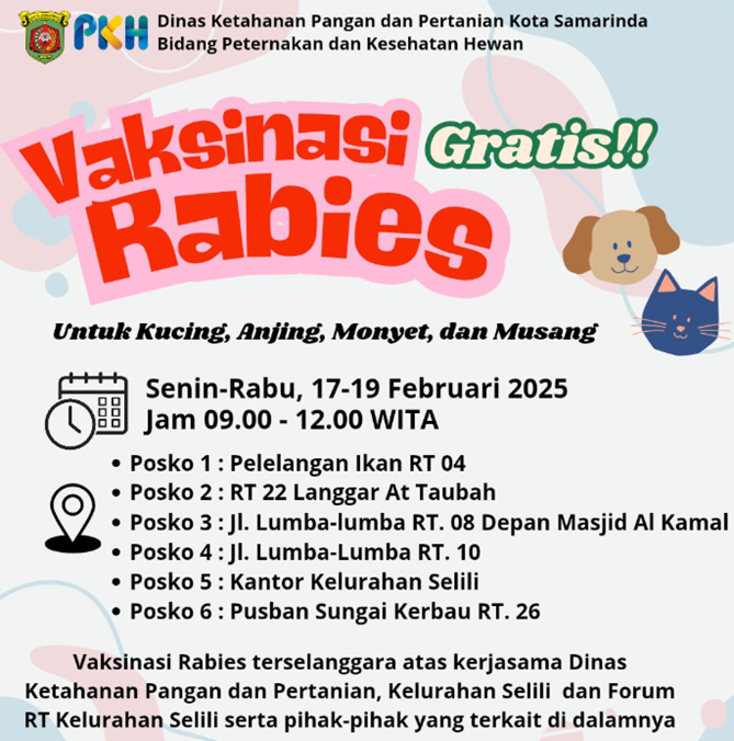 Vaksinasi ini dilaksanakan selama tiga hari, yaitu mulai 17 – 19 Februari 2025. Warga diimbau untuk membawa hewan peliharaan mereka, termasuk anjing dan kucing, ke posko-posko vaksinasi yang telah disediakan di beberapa titik di Kelurahan Selili.