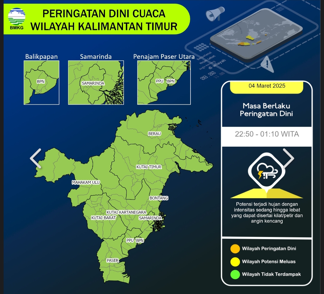 Jakarta, Satu Indonesia – Badan Meteorologi, Klimatologi dan Geofisika (BMKG) merilis Peringatan Dini Cuaca Wilayah Kalimantan Timur pada Selasa (4/3/2025) pukul 22:35 WITA.