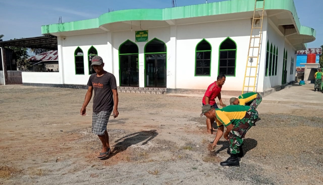 Nunukan, Satu Indonesia – Satgas Pamtas Yonarmed 11 Kostrad Pos Tanjung Aru bersama warga melaksanakan karya bakti membersihkan Masjid Babul Jannah di Desa Tanjung Aru, Kecamatan Sebatik Timur, Kabupaten Nunukan, Kalimantan Utara (Kaltara).