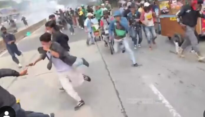 Pasukan polisi anti huru-hara mendorong massa aksi hingga ke arah jalan Tentara Pelajar untuk membubarkan massa yang terdiri dari warga, ojek online (ojol), beberapa pelajar dengan baju kaus bawahan celana abu-abu seragam SMA juga tampak di lokasi.