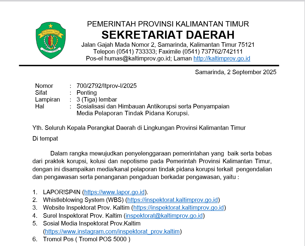 Sebagai bentuk komitmen, Pemprov Kaltim juga menyediakan sejumlah kanal resmi untuk melaporkan dugaan tindak pidana korupsi. Kanal tersebut meliputi SP4NLAPOR! (lapor.go.id), Whistleblowing System (WBS), situs Inspektorat Kaltim di inspektorat.kaltimprov.go.id, surat elektronik ke inspektorat@kaltimprov.go.id, akun Instagram @inspektorat_prov.kaltim, serta Tromol Pos 5000.