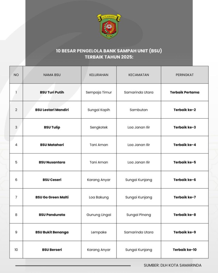 Hingga Oktober 2025, Kota Samarinda diketahui telah memiliki puluhan bank sampah yang berperan besar dalam menekan jumlah sampah masuk ke Tempat Pembuangan Akhir (TPA). Tercatat 4,11 ton sampah per hari berhasil dikelola melalui sistem bank sampah di tahun 2025.