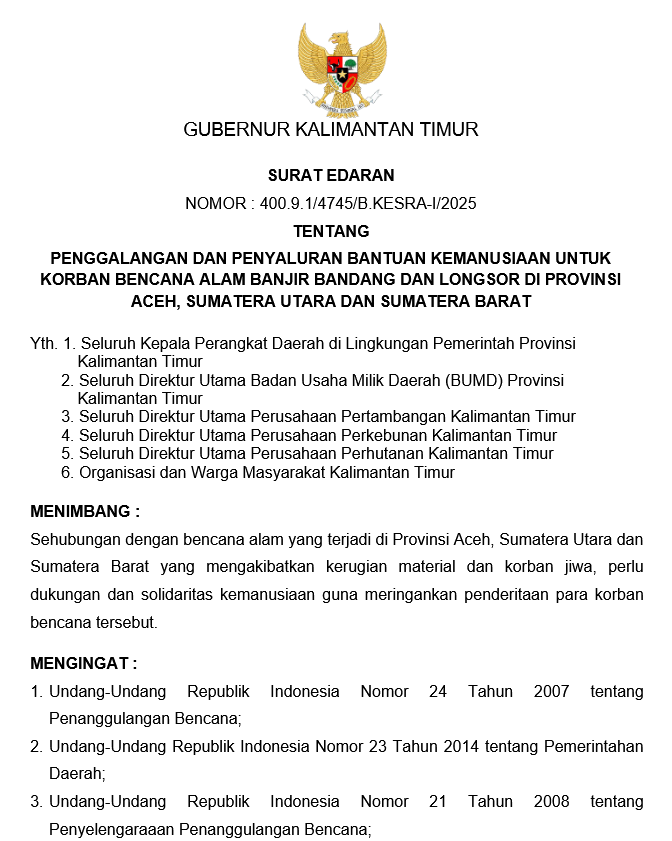 Melalui edaran tersebut, Gubernur Rudy Mas’ud mengajak seluruh Kepala Perangkat Daerah Pemprov Kaltim, Direktur Utama BUMD, perusahaan pertambangan, perkebunan, dan kehutanan, organisasi masyarakat, serta warga Kalimantan Timur untuk ikut serta menunjukkan solidaritas bagi korban bencana di Aceh, Sumut, dan Sumbar.