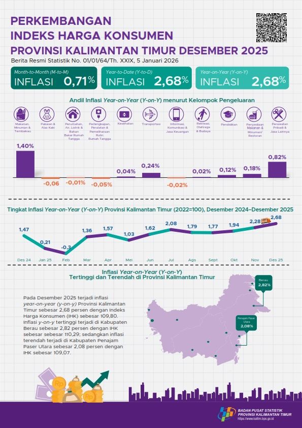 Samarinda, Satu Indonesia – Pada Desember 2025 terjadi inflasi year on year (y-on-y) Provinsi Kalimantan Timur sebesar 2,68 persen dengan Indeks Harga Konsumen (IHK) sebesar 109,80.